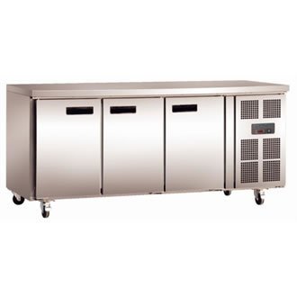 PRODUCT DESCRIPTIONS:A stainless steel counter fridge with ample refrigeration storage provided by a three door storage zone underneath. Lockable doors ensure that contents remain secure while the lockable castors enable this counter fridge to be moved easily, essential for a clean, modern catering space.