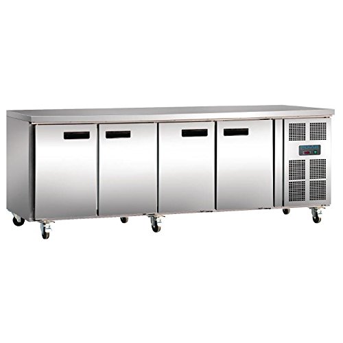 PRODUCT DESCRIPTIONS:A counter fridge that is built to work hard. With four door access to its 553 litre interior and a large counter on top for food preparation, this counter fridge is perfect where space is essential. The castors allow the fridge to be moved in busy catering environments where it is essential to clean underneath regularly. The electronic display ensures that the unit is easy to use and monitor.